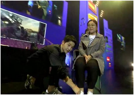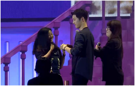 一身酷酷的黑套装,一曲温暖深情的《好久不见》,宋仲基以标准的中文演唱开启了粉丝见面会的第二部分互动。作为粉丝见面会现场游戏互动当然必不可少,仲基欧巴现场亲自邀请热情粉丝一起还原《太后》浪漫场景,拥抱、系鞋带、绑头发、遮太阳....5位幸运粉丝激动的心情,幸福的表情,现场摄影师拍下亲密瞬间,并由宋仲基现场签名赠送。